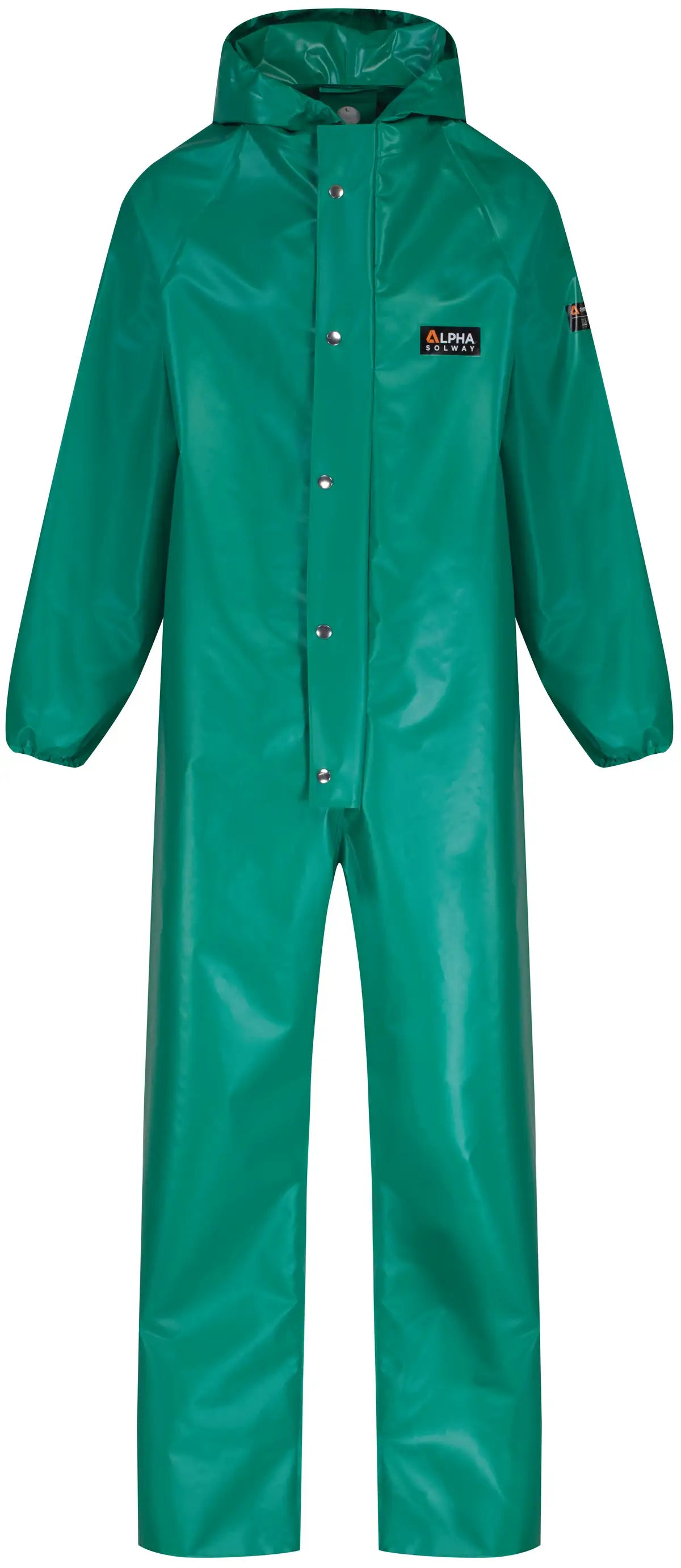 This Alpha Solway Chemmaster green coverall includes a hood. Its PVC material is extremely tough and durable and provides excellent resistance against acids, alkalis, and other common industrial chemicals.